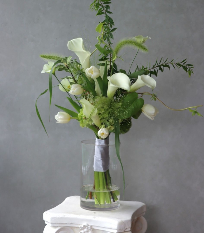 鬱金香、白桔梗、白玫瑰、小海桐葉、蠟梅、當季搭配花材