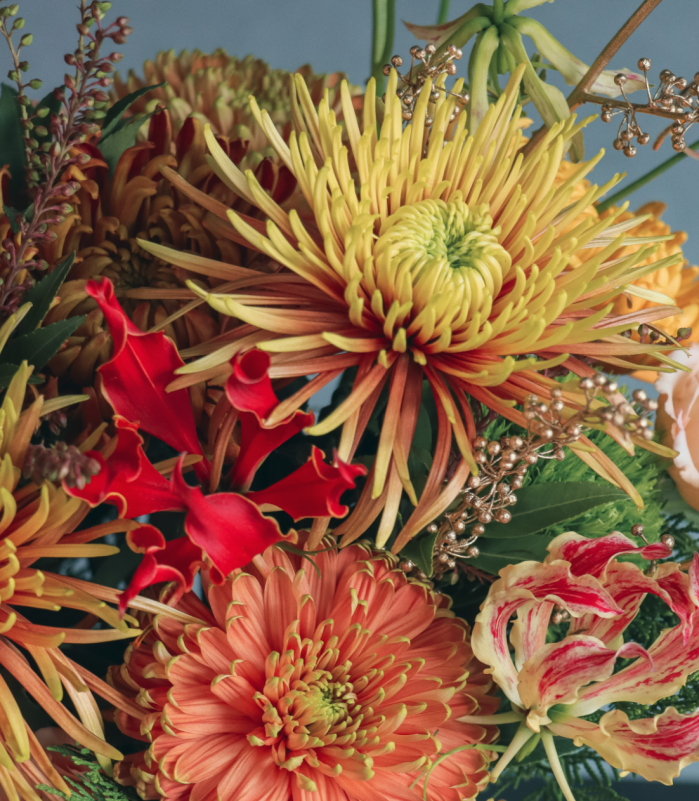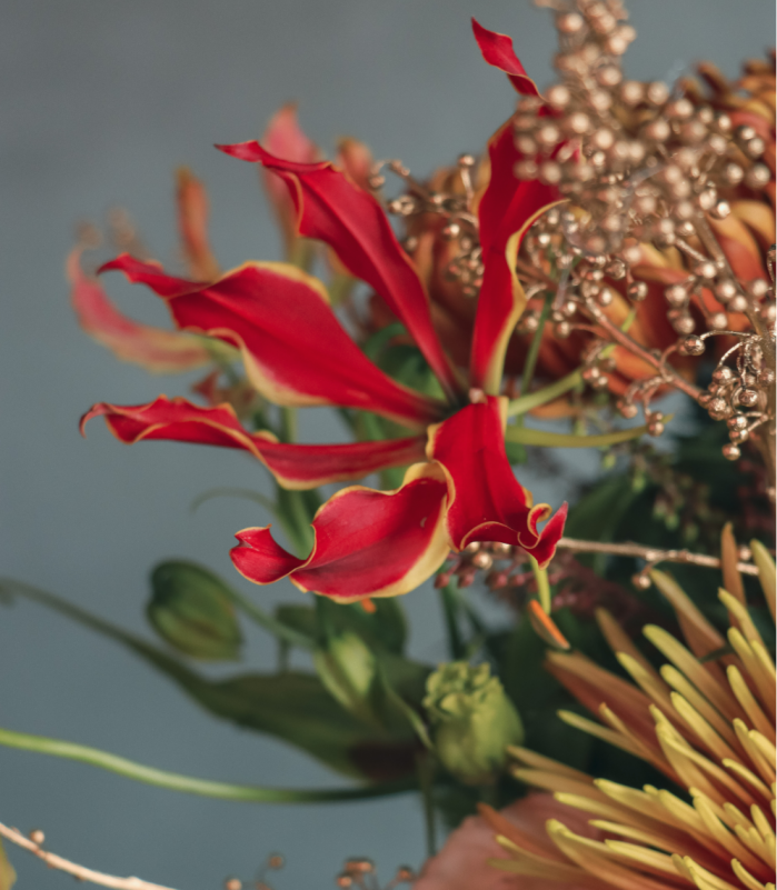 扁柏、金賞菊、橘黃菊花、金色胡椒粒、火焰百合、小夏桔梗、當季配花材