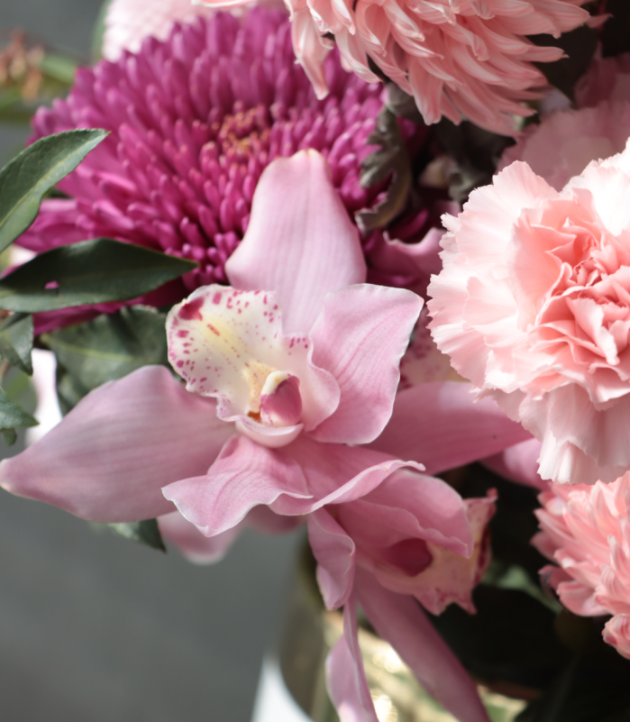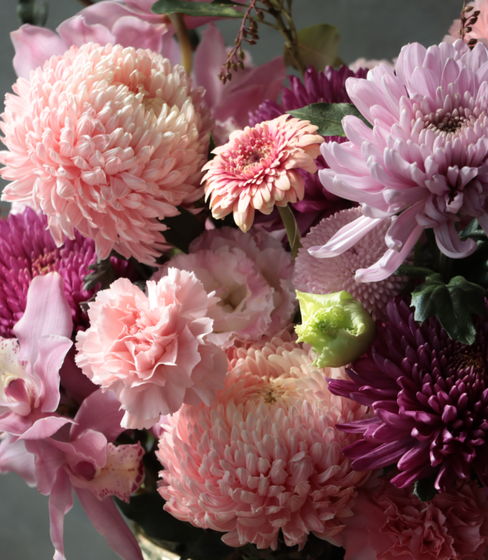 粉色牡丹菊、粉色羅莎諾、酒紅色菊花、進口粉色大康、粉色虎頭蘭、當季配花材。
