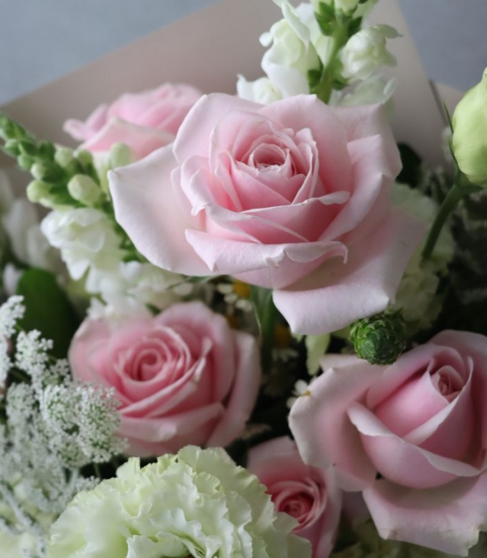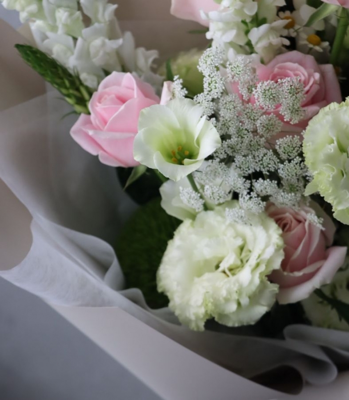 翡翠粉玫瑰 綠色桔梗 白金魚 蕾絲花 當季搭配花材