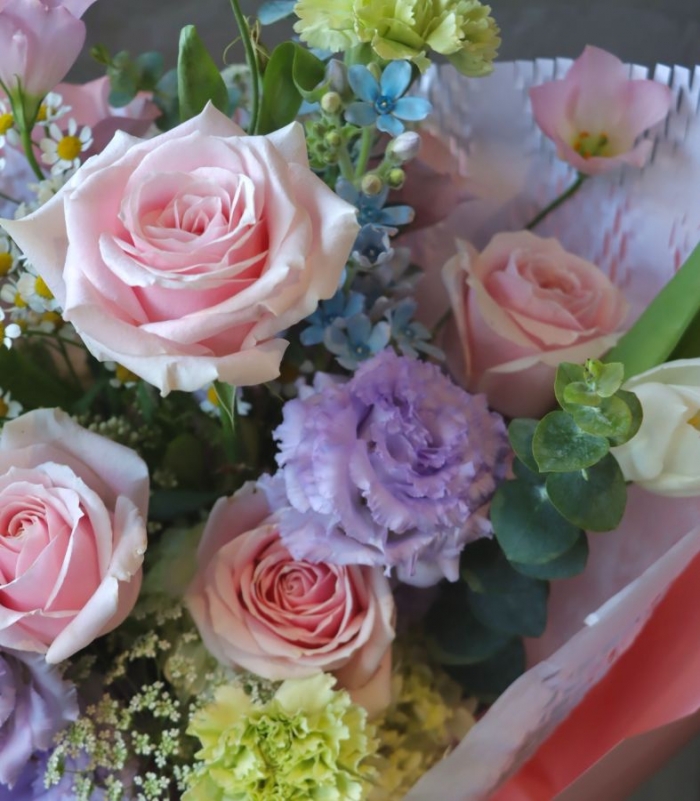 翡翠粉玫瑰、淺紫色桔梗、白色鬱金香...當季配花搭配。