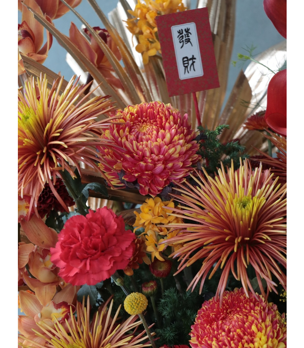 牡丹菊、煙火菊、進口橘黃虎頭蘭、海芋、當季配花材