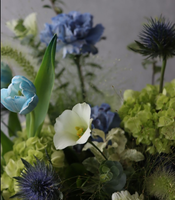 染色鬱金香、單瓣桔梗、藍色繡球花、當季搭配花材